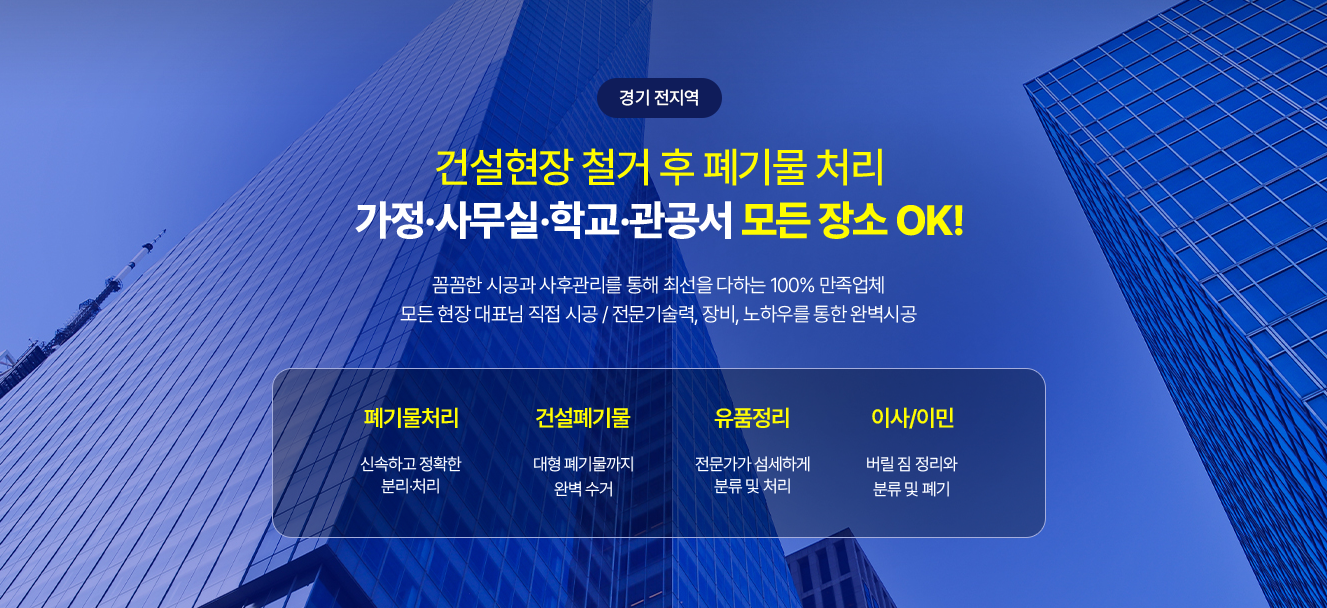 철거 및 공사 후 발생하는 폐기물 등을 전문장비와 함께 안전하게 수거 및 처리합니다.